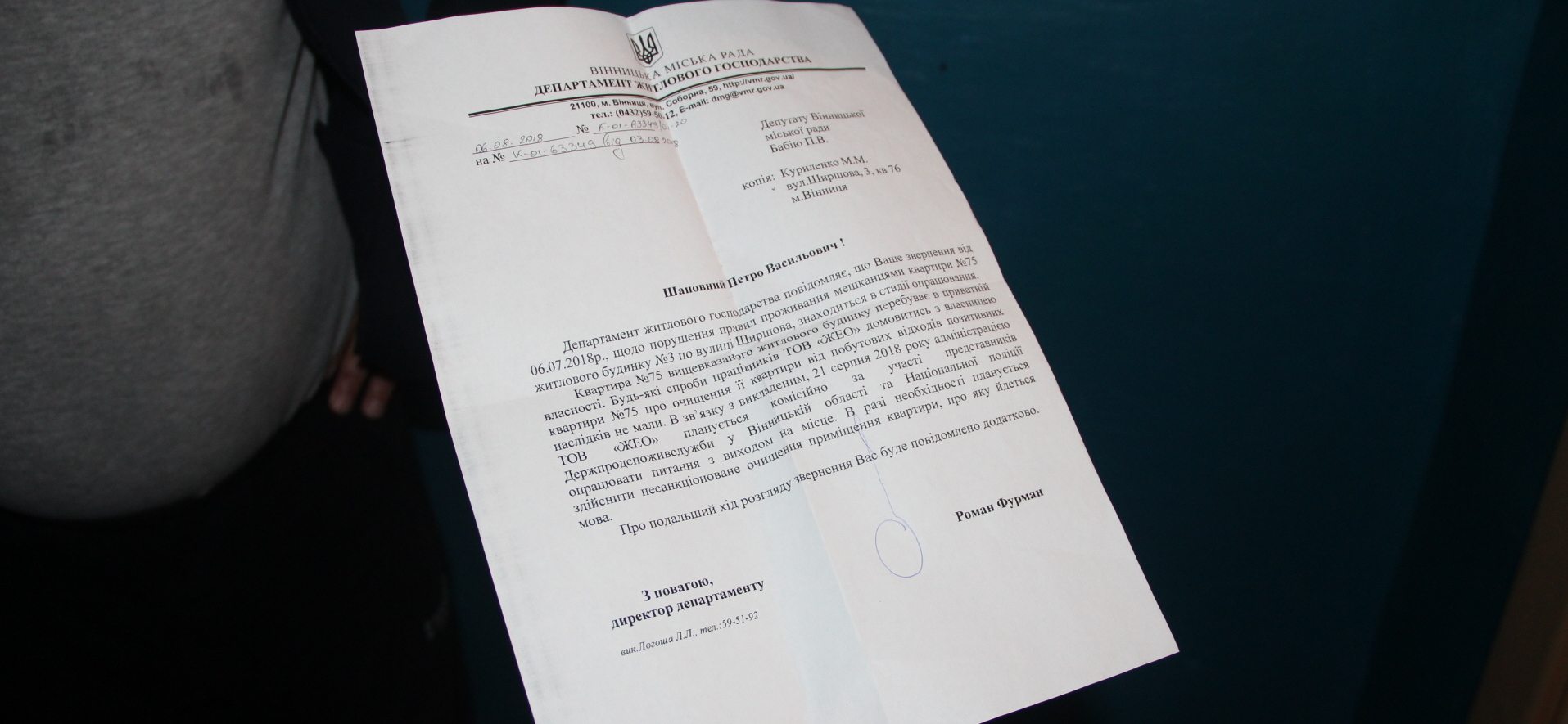 – Тоді у супроводі поліції все виносилося, вичищалося, але ситуація повторюється знову і знову. Очевидно, що у людини є проблеми із психікою і нічого не зміниться, скільки б разів не забирали те сміття з квартири. Все буде повторюватися. Я ще минулого разу радив людям збиратися і писати колективну заяву до суду, тому що людина потребує примусового лікування. Авторами заяви можуть бути тільки співвласники будинку. А ми у свою чергу допоможемо їм захистити права. Днями наші фахівці виїздили на місце за зверненням жителів, ця ситуація у роботі, ми обов’язково відреагуємо, – обіцяє директор департаменту житлового господарства Вінницької міської ради Роман Фурман.