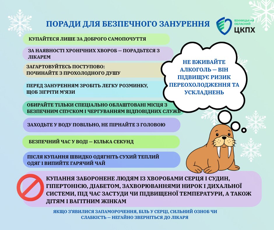 Однією з поширених традицій на Водохреще є купання в ополонці після освячення води. Купання в крижаній воді може бути небезпечним для здоров’я. Різка дія холоду здатна викликати серйозні ускладнення навіть у здорових людей.