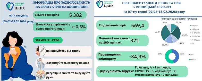 Усього на Вінниччині на 7-й тиждень поточного року захворіло 5382 особи. Динаміка у порівнянні з попереднім тижнем становить 0,5 відсотки.