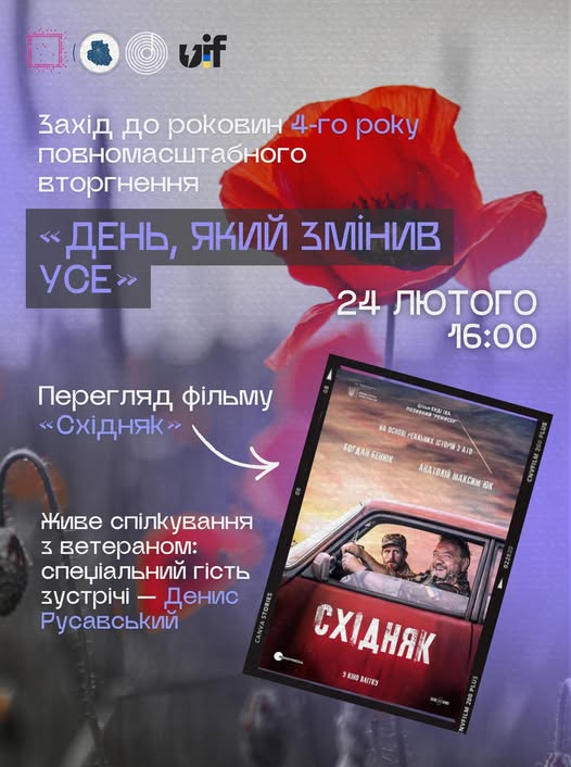 Програма вечора включає перегляд фільму «Східняк», а також живе спілкування з ветеранами: Денисом Русавським, учасником бойових дій з 2015 року, та старшим солдатом Романом Ковальським з 120-ї Вінницької бригади ТрО.